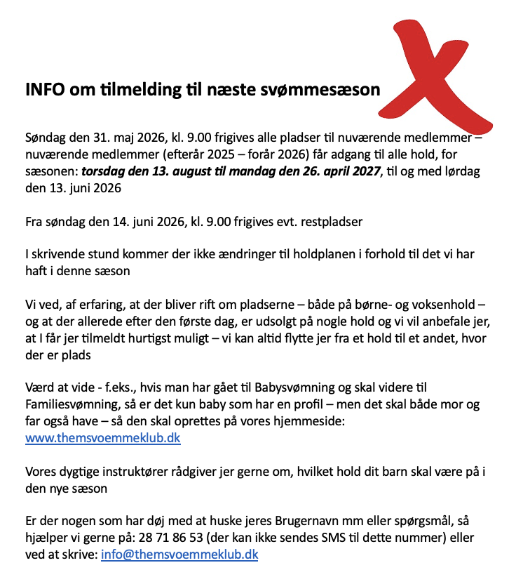 Har du brug for hjælp til at finde det rigtige svømmehold eller andre spørgsmål, er du velkommen til at ringe til kontoret: 28 71 86 53 (der kan ikke sendes SMS til dette nummer) eller til at skrive til os: info@themsvoemmeklub.dk